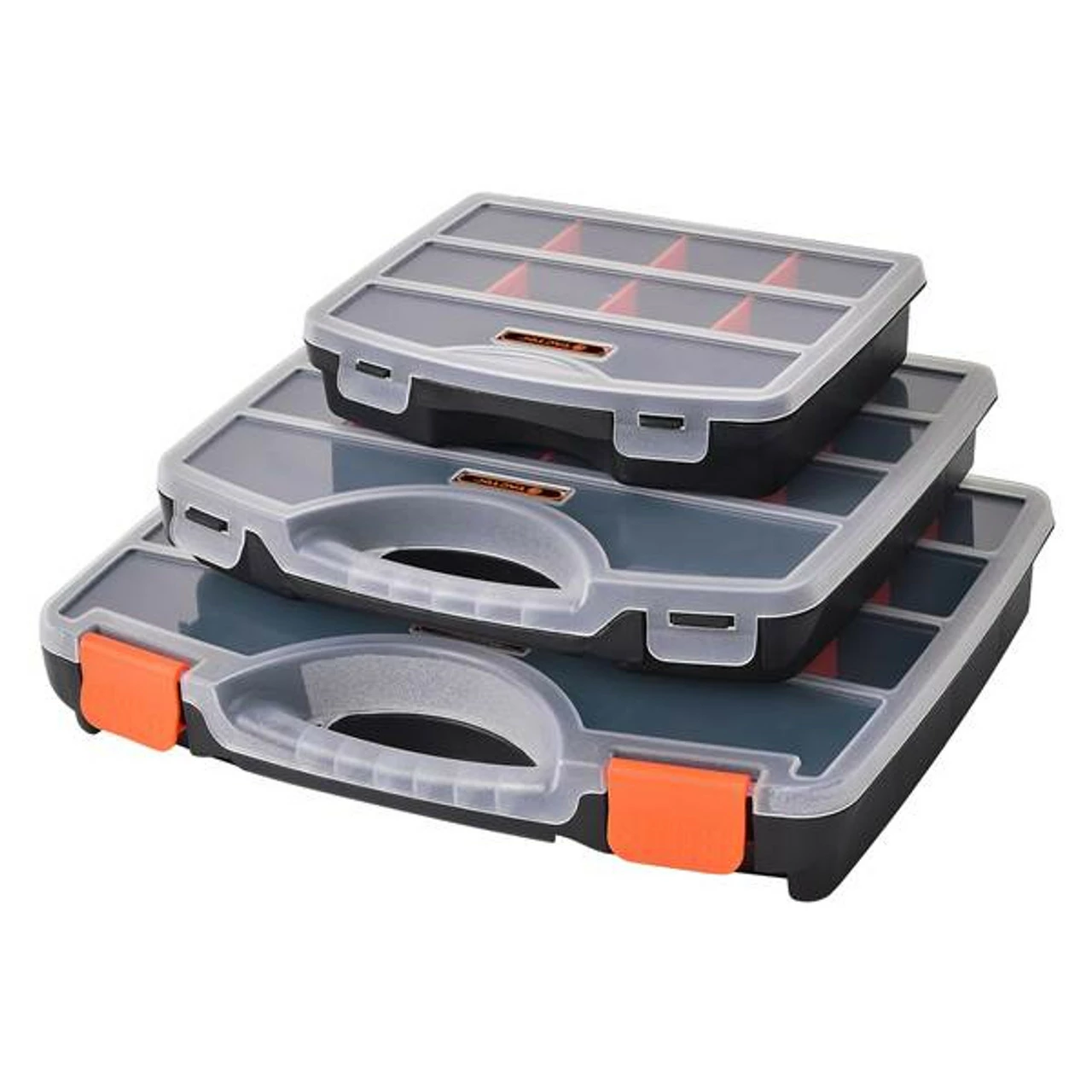 This handy 3pc set will help you keep all your favorite fasteners or small parts neatly organized with all of the adjustable compartments. Compartment dividers can be added or removed to suite your storage needs. The Transparent tops let you know what you have in all your compartments at a glance without the need to open.