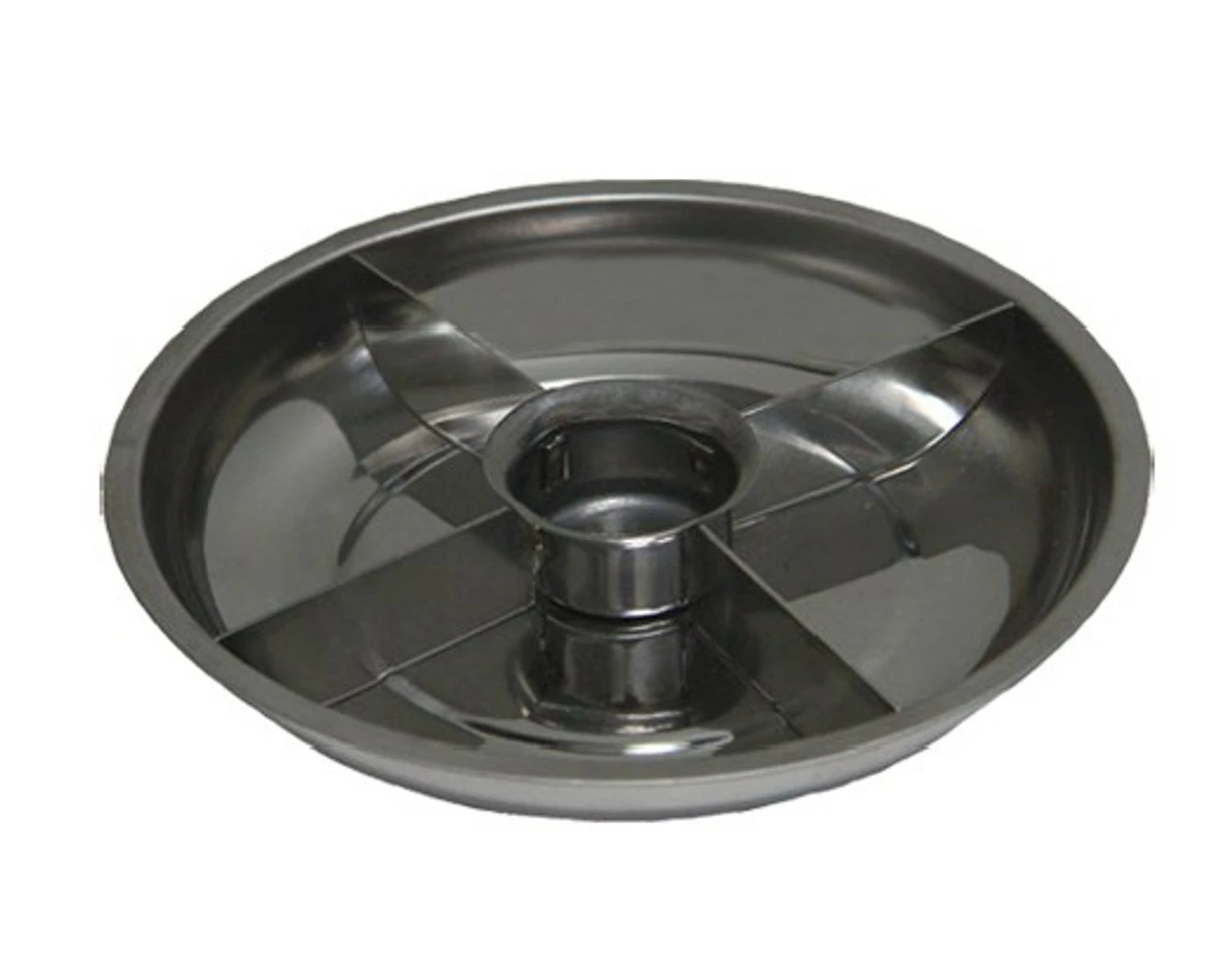 The round divided magnetic parts tray can be used to store nuts, bolts, screws, and other small metal objects. The bowl has a rubber-covered magnetic base for affixing to metal objects such as vehicle bodywork or toolboxes. Magnetism transfers to the inner surface of the bowl to retain small metal parts, such as nuts and bolts. The stainless steel mesh construction allows use in water-based cleaning tanks for small parts washing and/or degreasing