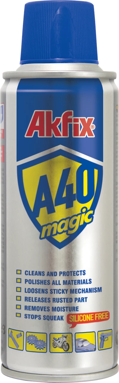 Akfix A40 is a Corrosion Inhibitor, Lubricant and Multi-Purpose Protector aerosol spray. Itβs special formula, combines many properties such as cleaning, lubricating, loosening rusted parts, and driving out moisture. It provides ultimate penetrating ability, loosens rusted or corroded bolts, nuts, cables, and fasteners. This product does not contain silicone or any dirt trapping additives. Can be used as protection on surfaces vulnerable to water and rust, cleaning, and maintenance, and dissolving adhesive materials like tar, gum, adhesive tapes, and more.