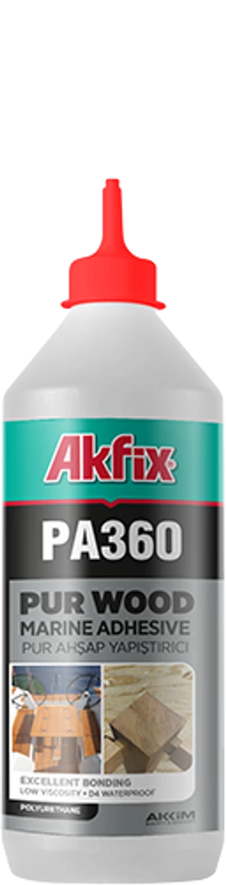 Akfix PA360 PUR Marine Wood Glue is a one-component, fast curing liquid polyurethane waterproof adhesive. It is a polyurethane glue that provides a 25–50-minute tack-free time with a recommended 60-minute compression time. This professional grade glue is formulated for multi-purpose applications including furniture, marine products, flooring, stairs, and more. In addition to its superior wood-to-wood performance, PA360 is ideal for various porous and non-porous substrates, such as, concrete, metal, polystyrene foam and more. This product can be applied in slightly wet substrates, is easily sanded and is unaffected by stain.