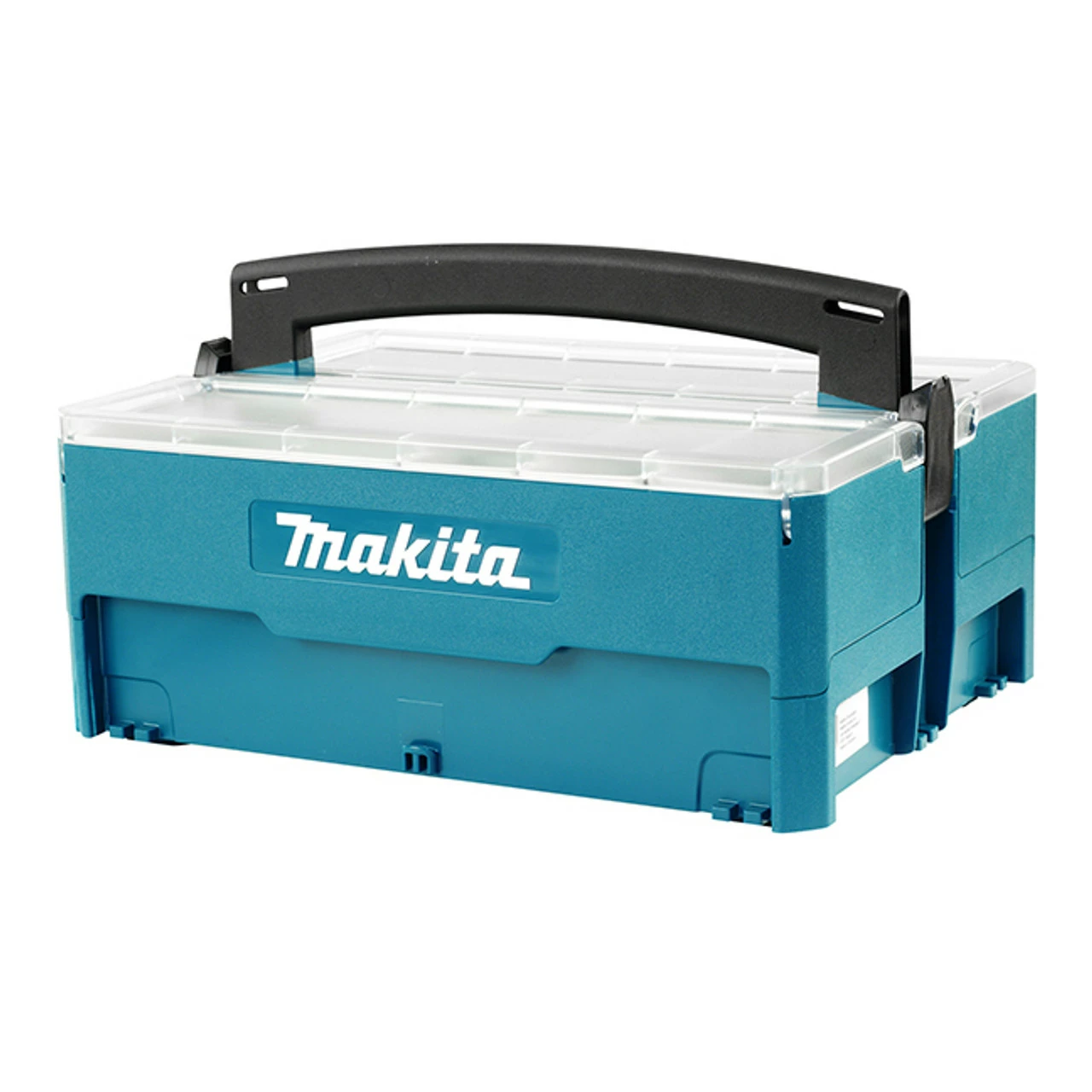 This interlocking storage box has a cantilever tray design provides maximum storage efficiency and easy access to all compartments. This storage box easily attaches onto tops of Makita Interlocking Cases