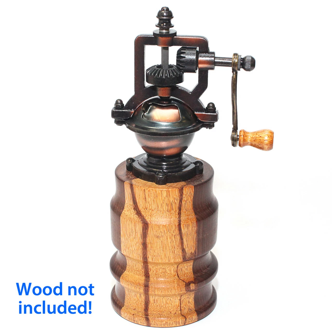 Have you ever wanted to turn a traditional pepper mill but have been fearful of the process involved in creating one? Now you can with our Antique Hand Crank Pepper Grinder, a simple and straightforward turning kit! Simply use any 3″ x 3″ wood blank by whatever length you desire your grinder to be, mark the center and drill a 1″-diameter hole through the center of the blank to allow the pepper to pass through. Mount the blank between centers by utilizing a jamb chuck. Next turn to your desired profile, sand, finish, and attach the grinder to the top of your turned piece. Now you have a one-of-a-kind antique looking pepper grinder. Grinder mechanism measures 2″ in diameter x 4-3/8″ tall and features an Antique Copper finish, cast metal parts, and a finial that adjusts for coarse to fine granules.Β