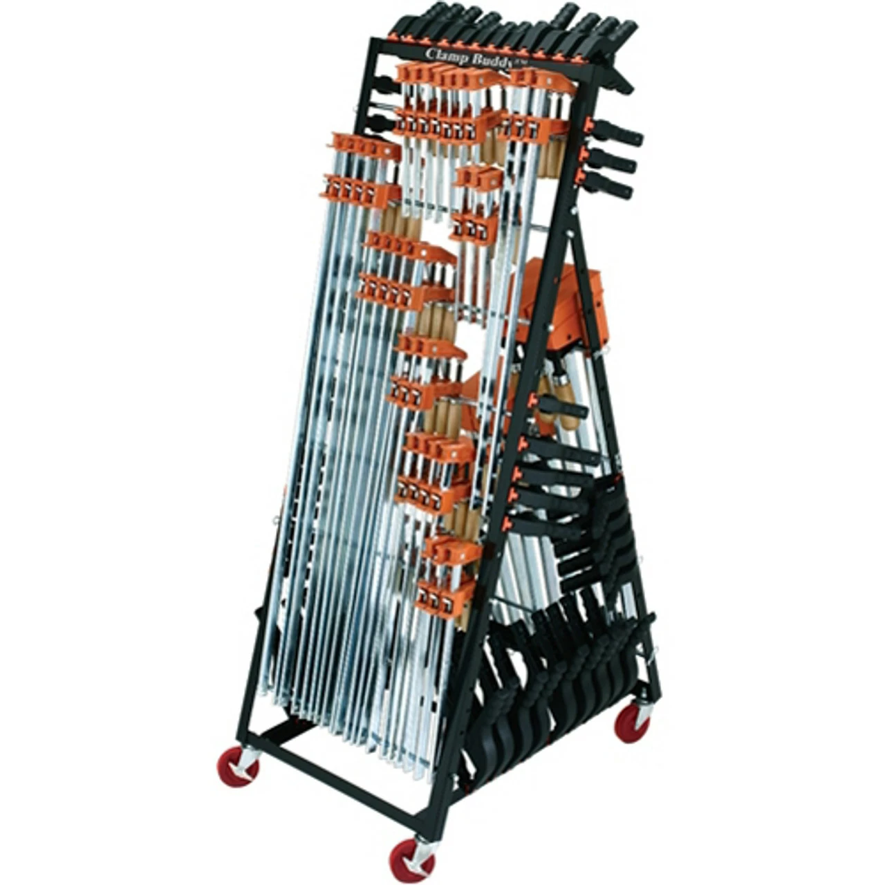 Organize and increase shop space by storing all of your clamps on this heavy duty clamp storage system. Bar clamps, K-Bodies, Parallel clamps, F clamps, Spring clamps, store just about any clamp. With the ability to hold over 200 clamps, the rugged steel frame can support up to 500 lbs. Heavy Duty locking castors and adjustable cross bars make this storage system useful for any shop.