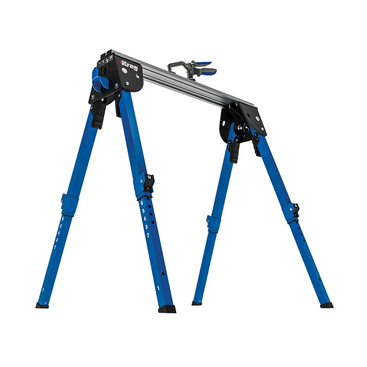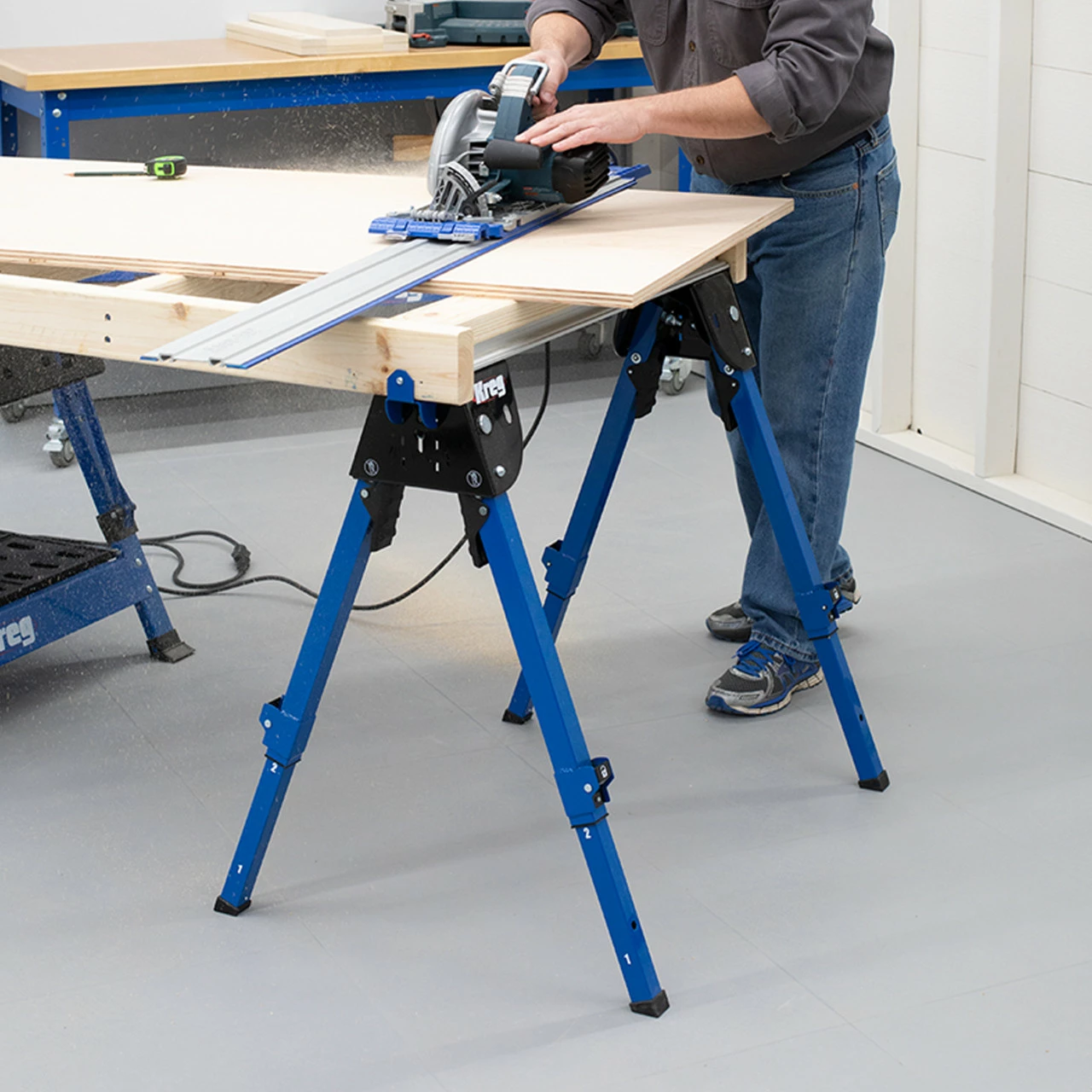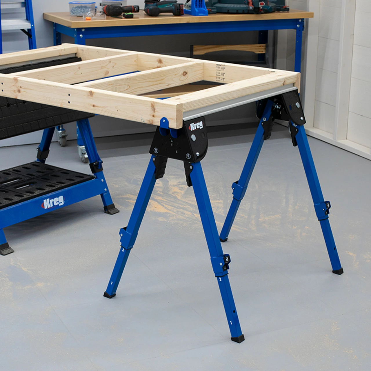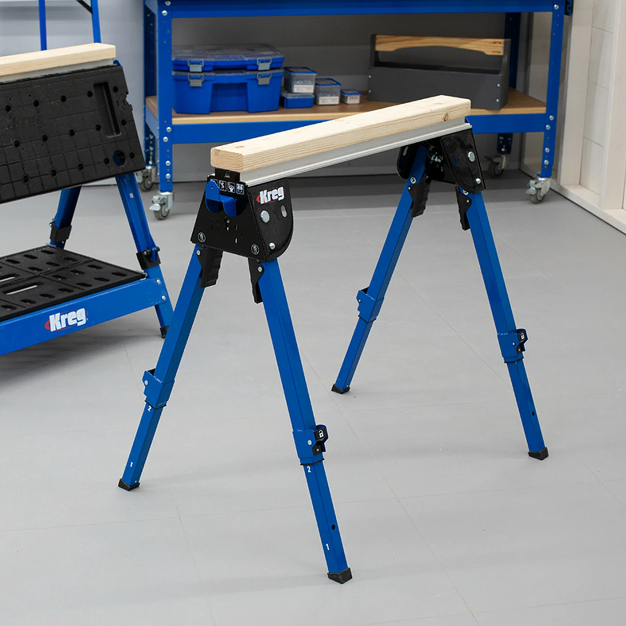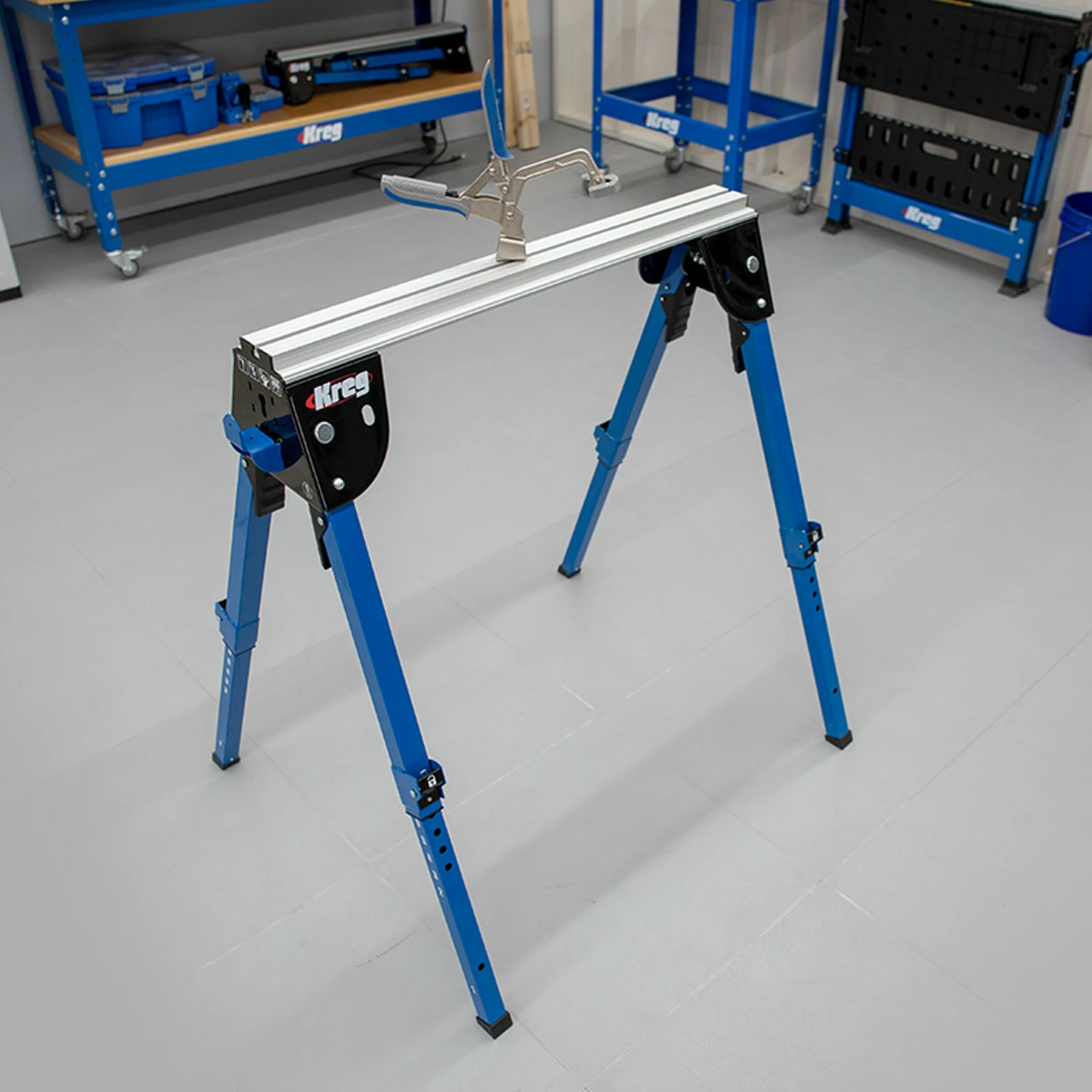 The Kreg Track Horse makes it easy to set up a sturdy work support anywhere to help turn any place into a workspace. Adjustable legs feature six working heights to match any task. The Track Horse is equipped with versatile features that give the Track Horse capabilities beyond any traditional sawhorse. This durable Track Horse is constructed from steel and aluminum making it rugged and secure while giving it a load capacity of 2,200 lbs. (997 kg) per pair. This Track Horse is capable of Handling large projects and heavy material.
